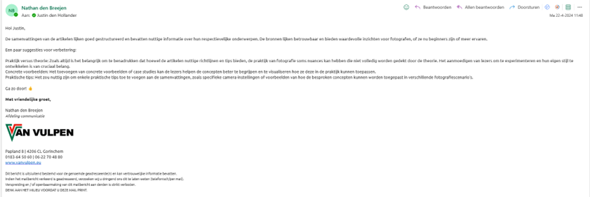 Ik heb feedback gevraagd aan Nathan den Breejen, Communicatiespecialist bij Van Vulpen, die veel ervaring heeft met fotografie. Ik zag de meerwaarde ervan in om mijn samenvattingen door hem te laten controleren om de kwaliteit van de informatie te waarborgen. Hieronder vind je zijn feedback en een aantal toevoegingen: