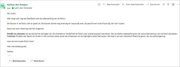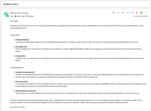 Feedback vanuit Nathan den Breejen (Fotograaf en communicatie medewerker van Vulpen)