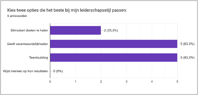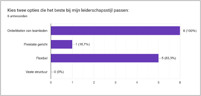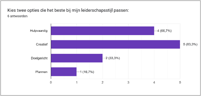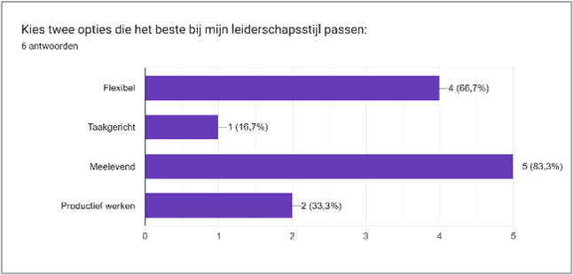 De vragenlijst is ingevuld door de 6 teamleden waar ik de afgelopen periode de leiding over had voor een bepaald project. De vragenlijst heeft een mix van kenmerken van verschillende leiderschapsstijlen, aan de respondenten de keuze om steeds 2 kenmerken te kiezen die zij het beste bij mijn manier van leiderschap nemen horen.