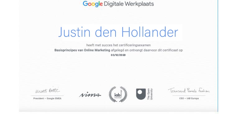 Ik heb de cursus:'' Basisprincipes van Online Marketing '' succesvol afgerond. Hieronder is het certificaat te vinden als bewijslast.