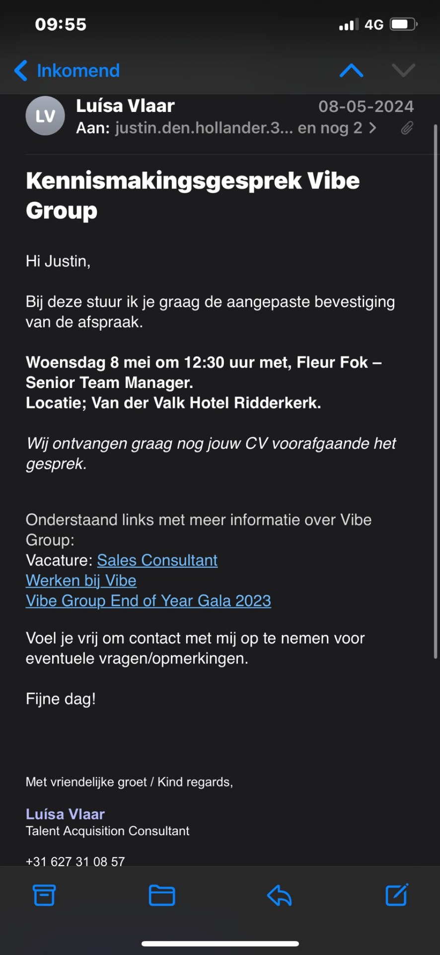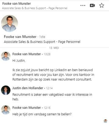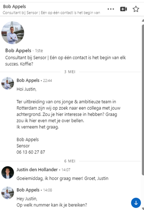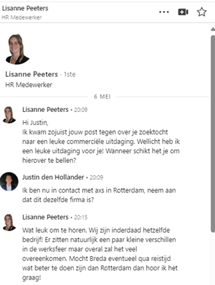 Na contact te hebben gekregen met Fleur Stok van Vibe Group naar aanleiding van mijn LinkedIn bijdrage, heb ik de kans gekregen om in gesprek te gaan over het bedrijf en het vakgebied. Deze eerste stap heeft mij de mogelijkheid geboden om meer inzicht te krijgen in het type mensen dat bedrijven zoeken en welke competenties nodig zijn voor een commerciële salesfunctie. Tijdens het gesprek bij Van der Valk Ridderkerk met een teammanager van Tergos, een onderdeel van Vibe Group, werd ik positief verrast. Fleur deelde veel waardevolle inzichten over de sector en wat het inhoudt om succesvol te zijn in een commerciële salesbaan. Dit heeft mij geholpen om een beter beeld te krijgen van mijn potentiële doelgroep en om te beoordelen of een dergelijke functie bij mij past. Het gesprek verliep zo positief van beide kanten dat er een vervolgafspraak gepland is. Dit is een veelbelovende stap naar mijn verdere carrièreontwikkeling binnen dit vakgebied.
